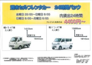 軽トラ、軽バン 週末レンタカー24時間利用!ご予約スタート!!